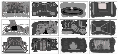 After making these basic layouts I decided I'd feel happier with a interior hallway shot, or ccentral chamber, since they have the big features.